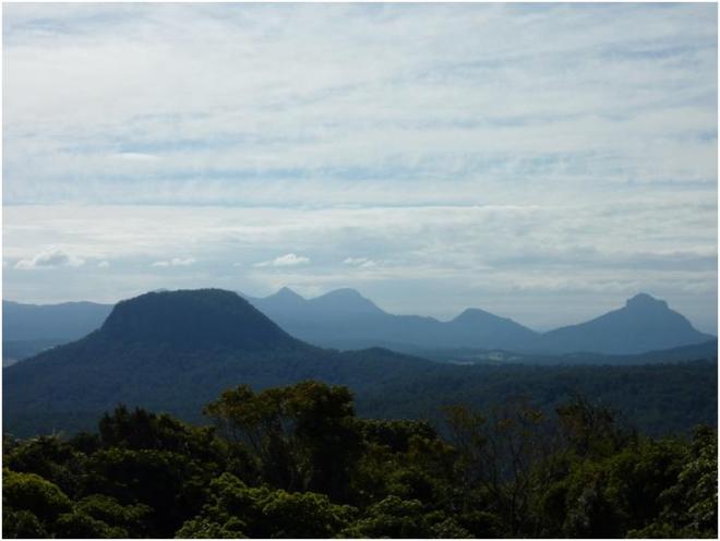 Arriving at the top was glorious (see pic, with Dome Mountain in the foreground, looking north toward Brisbane Ranges National Park), and all the more for the hard work of the walk. Climbing to the first level of the fire tower, we had a near 360° view across volcanic plugs like Dome Mountain and Edinburgh Castle, beyond Urbenville and Woodenbong, and to the southwest down along the valley toward Upper Tooloom.
