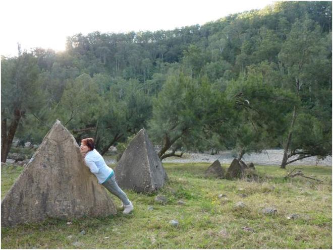 We rattled another 40 odd kilometres down the track to Paddys Flat, where the road crosses the Clarence River. Here we found the WWII tank traps (see pic, with Erin giving the size perspective), supposedly set up along